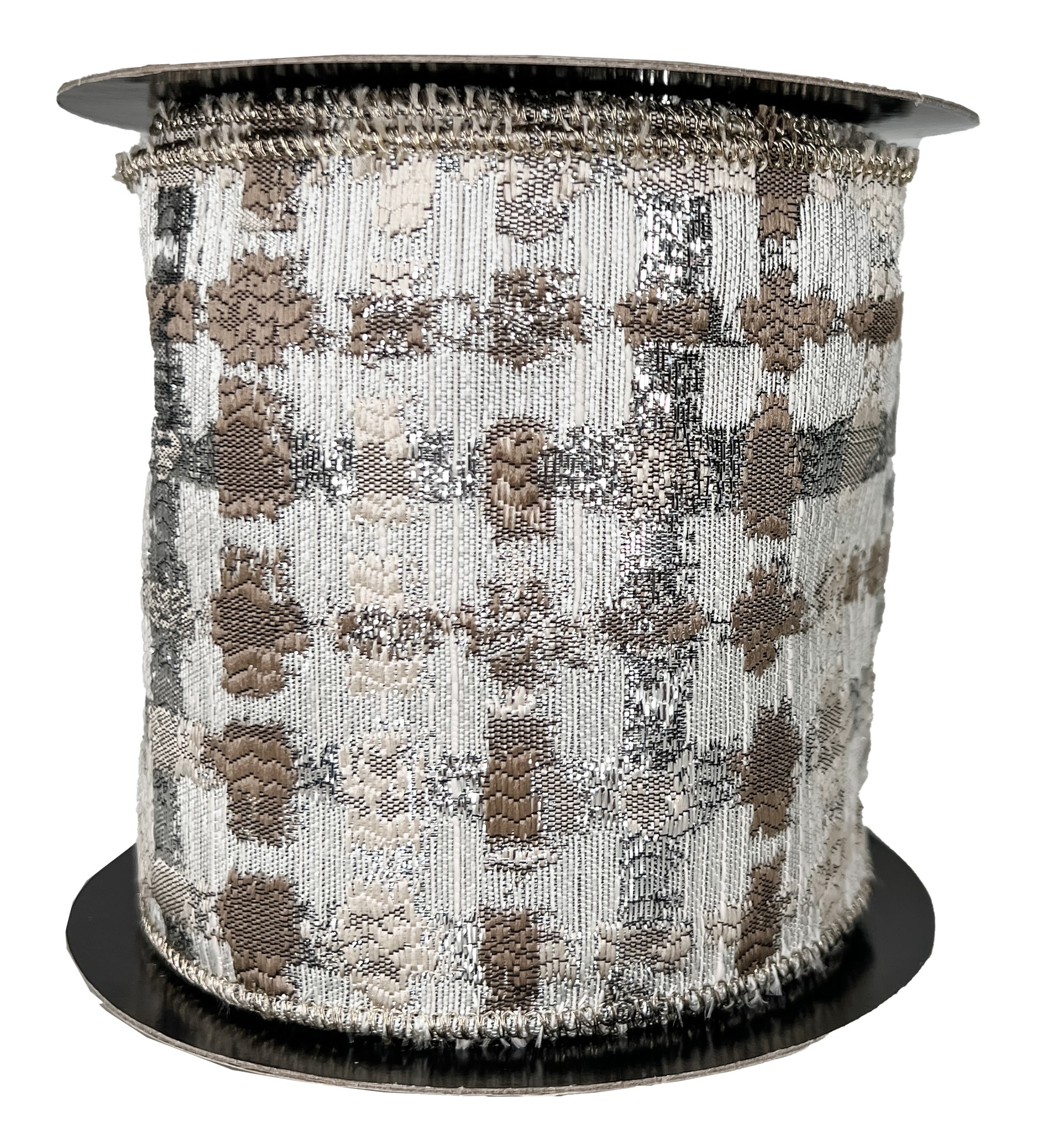 Entrancing and understated - all at the same time. This woven single layered wired ribbon blends all shades of metallic taupe, platinum and cream to create winter ribbon that elevates and calms.